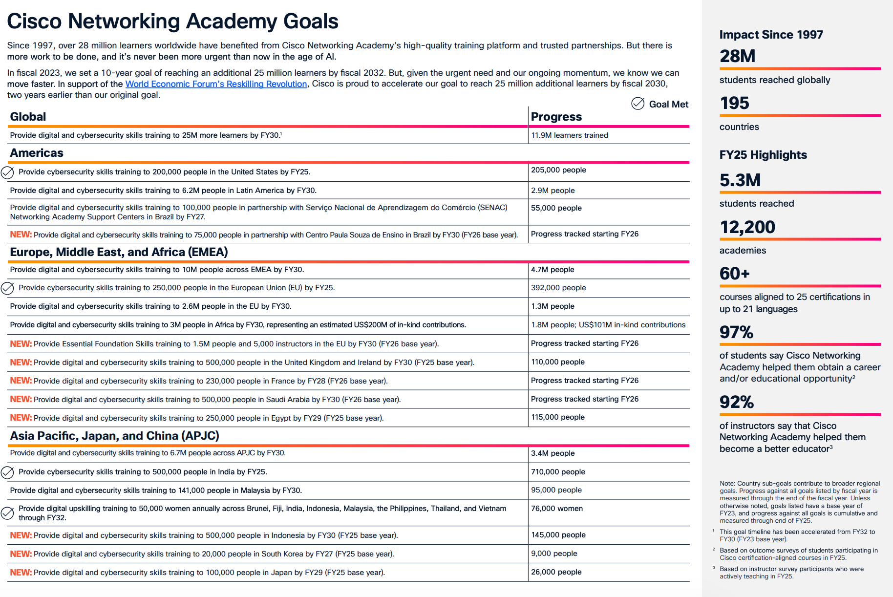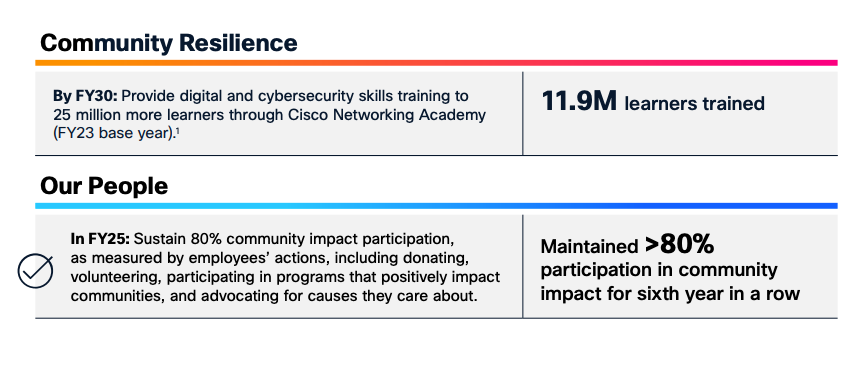 - Cisco and Cisco Foundation made $650 million in cash and in-kind donations and employees volunteered 573,000 hours in FY25.