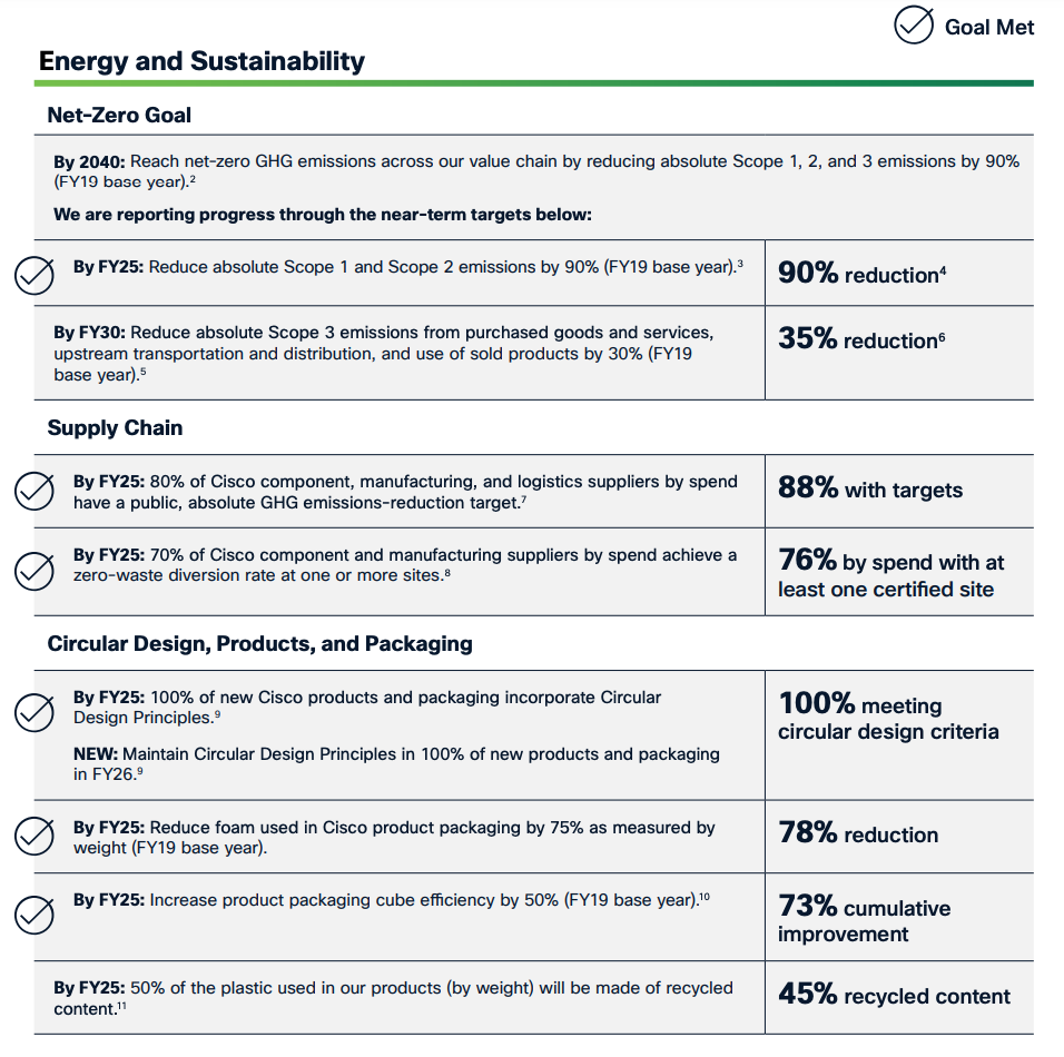 Announced a new circular IT payment solution for customers called Cisco Green Pay that encourages the circular use of its sustainable technologies. The new payment model offers a 5% incentive on Cisco hardware, predictable payments for five years, free product returns, and a certificate verifying the product’s circular journey. (April 2022)