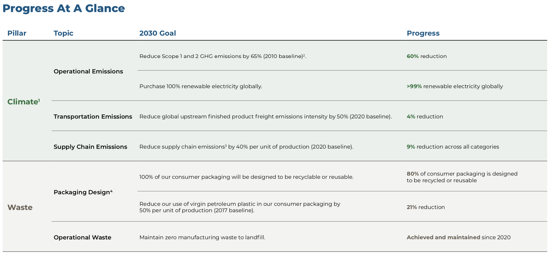 - Reduced supply chain emissions by 9% per unit of production and reduced upstream product freight emissions by 4% since 2020.