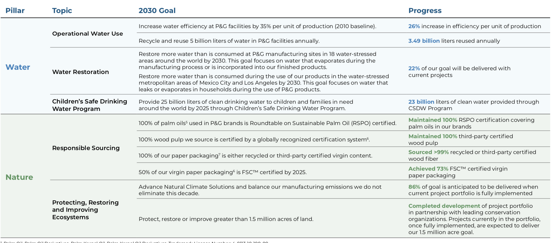 - In water-stressed Los Angeles and Mexico City, which account for over half of the total water consumed during the use of P&G products across 18 priority water-stressed areas, a first-of-its-kind goal aims to restore more water than is consumed during customer use of P&G products.