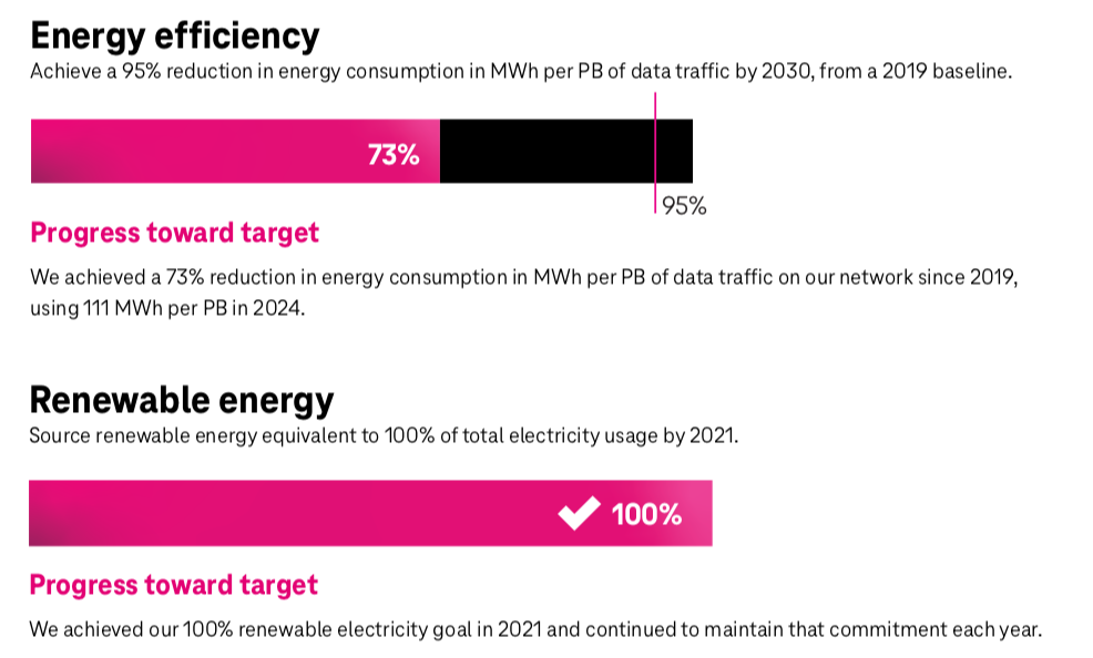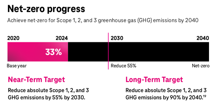 T-MOBILE — Announced its commitment to achieve net-zero across its entire value chain by 2040. This will make T-Mobile the first U.S. wireless company to set a net-zero goal for all three emissions scopes that has been validated by SBTi. The company also signed onto The Climate Pledge. (Feb 2023)