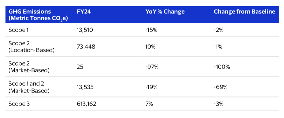 - In Fiscal Year 2024, reduced Scope 1 and 2 emissions by 69% and reduced Scope 3 emissions 3% (FY2019 baseline).